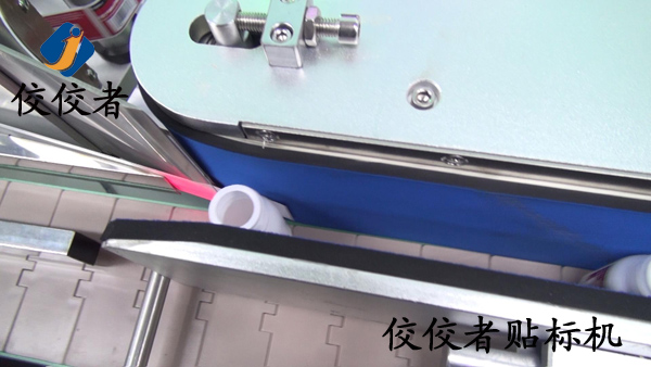 (上圖)接著展示的是剝離的標簽正好貼在輸送中的小圓瓶上,同時即將經(jīng)過一端正在運行的覆標海棉通道,覆標完成貼標過程看似只有一秒鐘的時間,在這個時間中,機器進行了一系列的工作:測物電眼檢測到小圓瓶時,回饋一個信號給PLC,PLC再發(fā)出出標信號,標簽繼續(xù)剝離時貼在經(jīng)過的小圓瓶上,小圓瓶再經(jīng)過覆標機構(gòu).至此,貼標過程就已經(jīng)完成了. (操作過程:放產(chǎn)品—>分瓶(設(shè)備自動實現(xiàn))—>貼標并覆標(設(shè)備自動實現(xiàn))—>貼標完成。)下圖是貼好標簽的產(chǎn)品: