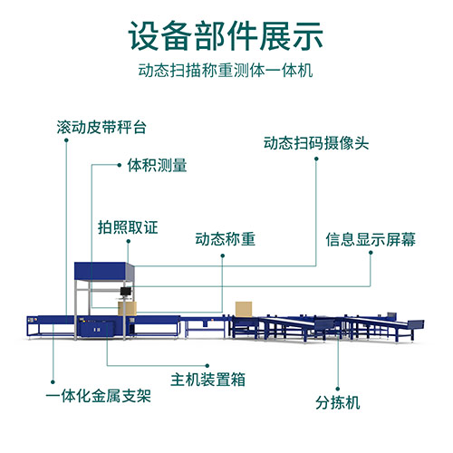 DWS設(shè)備其實(shí)用中文翻譯過(guò)來(lái)就是集稱重掃碼。測(cè)體積一體的一臺(tái)設(shè)備。這臺(tái)設(shè)備可以對(duì)接系統(tǒng),實(shí)時(shí)上傳數(shù)據(jù)。如果有需求的話,還可以添加分揀功能,根據(jù)您的需求添加多個(gè)分揀口,掃碼以后將貨物分揀到您指定的出口處統(tǒng)一管理。