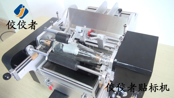 將玻璃瓶放到貼標機上,隨著瓶子的轉(zhuǎn)動便被貼上了標簽,如下圖: